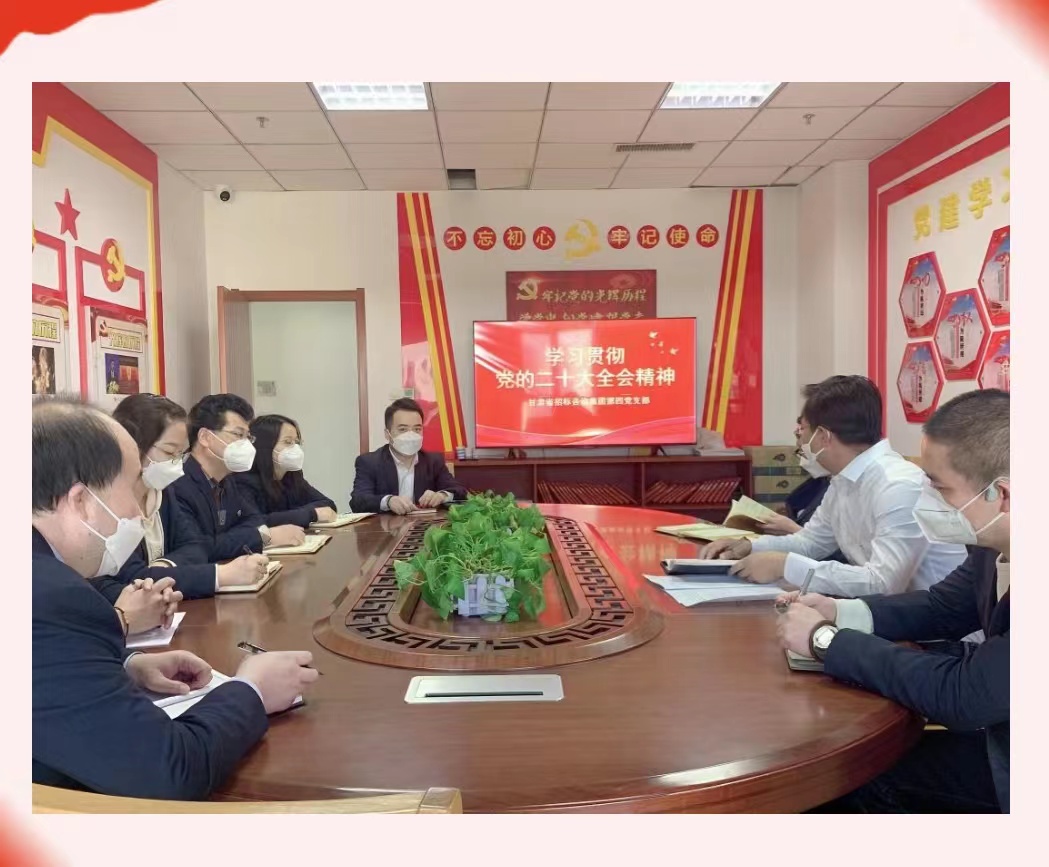党的二十大胜利召开以来,甘肃省招标咨询集团有限责任公司党委高度重视,将学习宣传贯彻党的二十大精神作为当前和今后一个时期的首要政治任务,通过多形式、全覆盖的方式,积极抓好贯彻落实,持续推动党的二十大精神转化为加快各项工作高质量发展的强大动力,努力促使党的二十大精神在招标咨询集团迅速落地生根、开花结果。